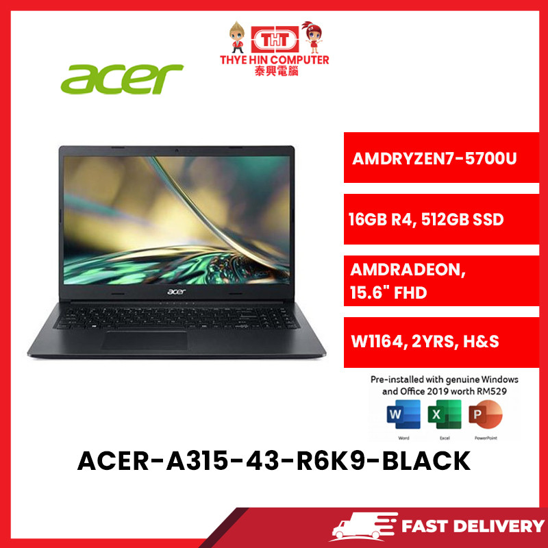 ACER-A315-43-R6K9-BLACK-AMDRYZEN7-5700U,16GBR4,512GBSSD,AMDRADEON,15.6"FHD,W1164,2YRS,H&S