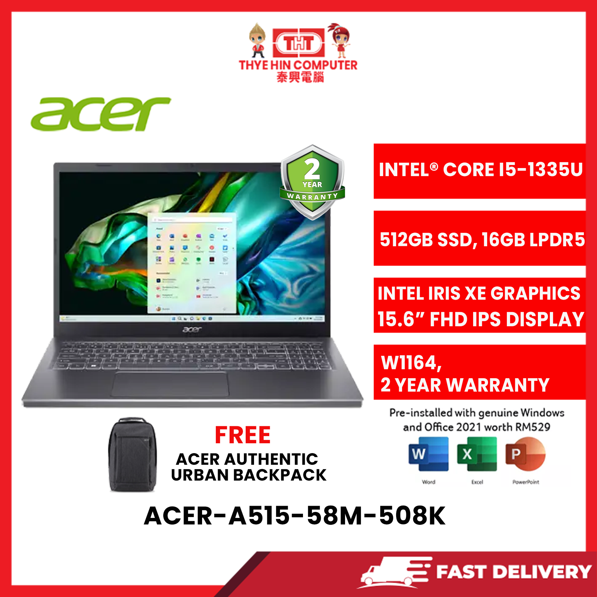 ACER-A515-58M-508K-GREY-INTELCOREI5-1335U,16GBR5,512GBSSD,INTELIRIS,15.6"FHD,W1164,2YRS,H&S