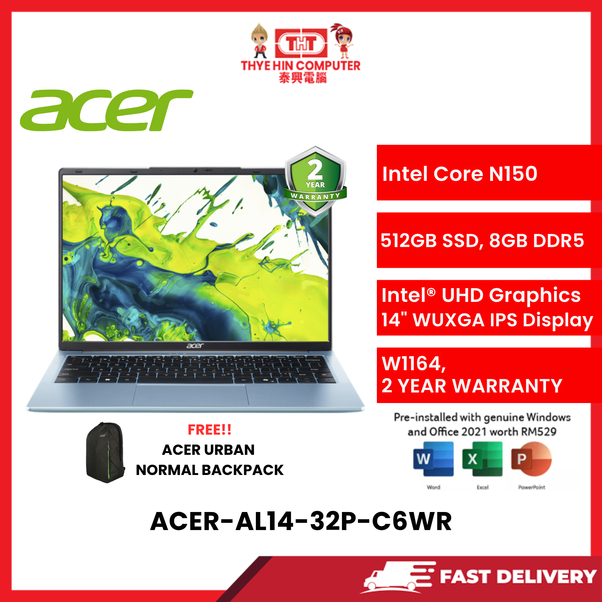 ACER-AL14-32P-C6WR-BLU-INTELCOREN150,8GBR5,512GBSSD,INTELUHD,14″IPS,W1164,2YRS,H&S [SBN:NO NILAI:NO MELAKA:NO HPS:NO]
