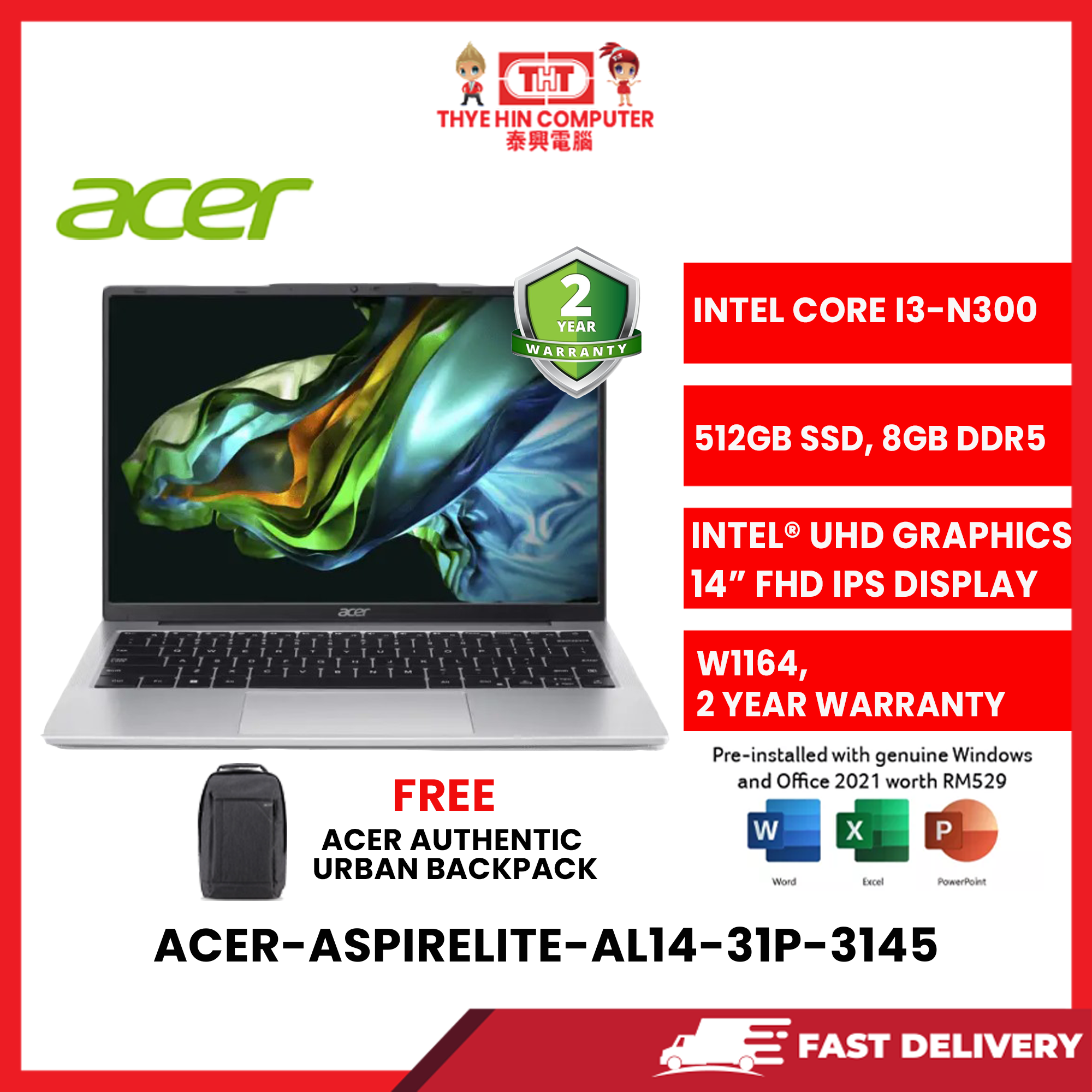 ACER-ASPIRELITE-AL14-31P-3145-SVR-INTELCOREI3-N300,8GBR5,512GBSSD,INTELUHD,14"IPS,W1164,H&S,2YRS