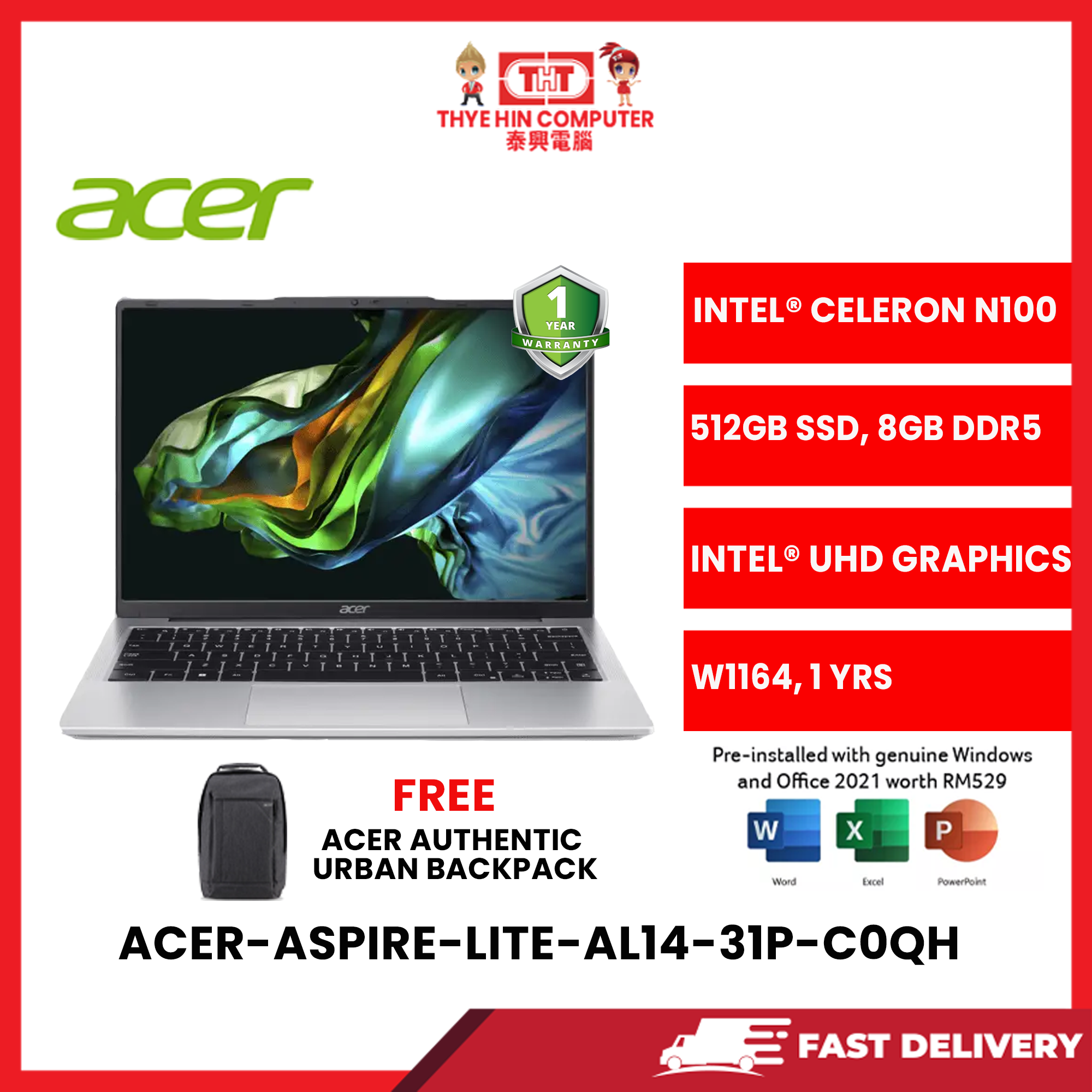 ACER-ASPIRELITE-AL14-31P-C0QH-SVR-INTELPROCESSORN100-3.4GHZ,8GBR5,512GBSSD,W1164,1YR,H&S