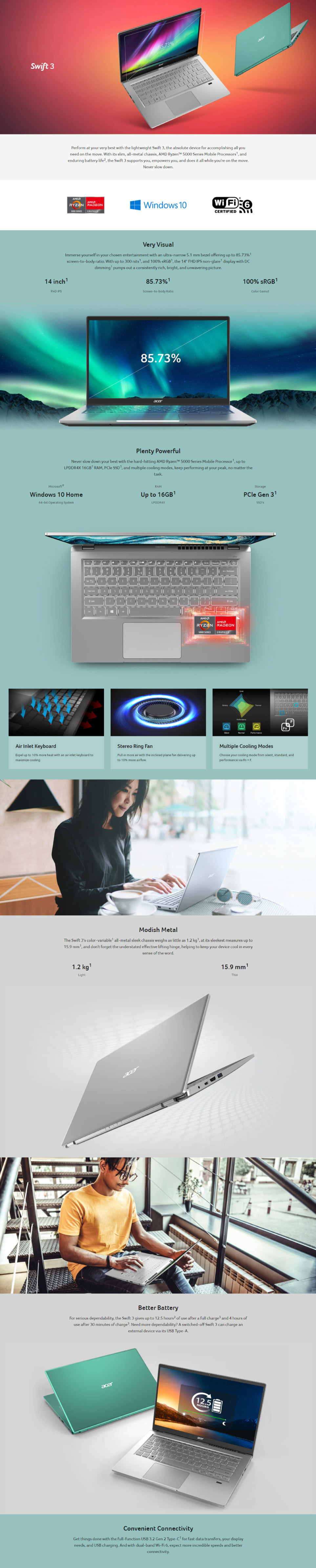 Product Features Pre-installed MS Office Home & Student CPU / Processor AMD Ryzen 5 5500U Processor Memory 8GB of onboard LPDDR4X system memory Storage 512GB PCIe NVMe SSD Graphic Card AMD Radeon Graphics Display Screen / Design / Resolution 14.0" IPS, Full HD 1920 x 1080, high-brightness (300nits) Acer ComfyViewTM LED-backlit TFT LCD Camera HD webcam with: