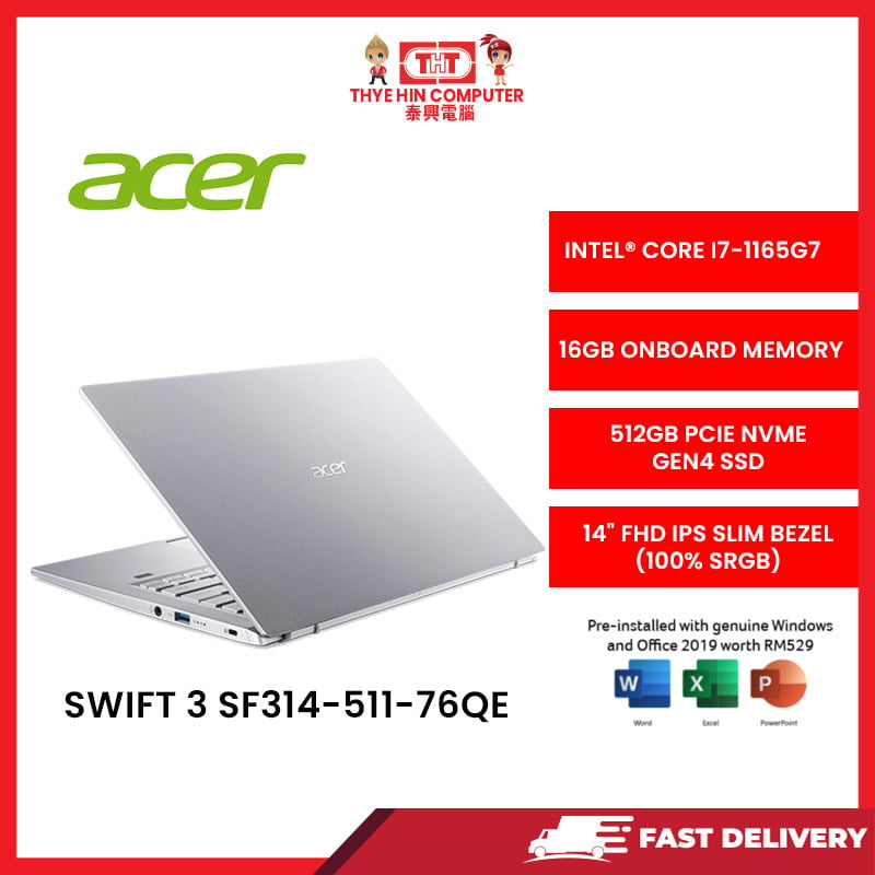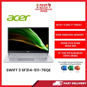 ACER-SF314-511-76QE-SVR-INTELCOREI7-1165G7,16GBR4,512GBSSD,INTELIRISXE,14″HD,W11H,2YRS,H&S [SBN:NO NILAI:NO MELAKA:NO HPS:NO]