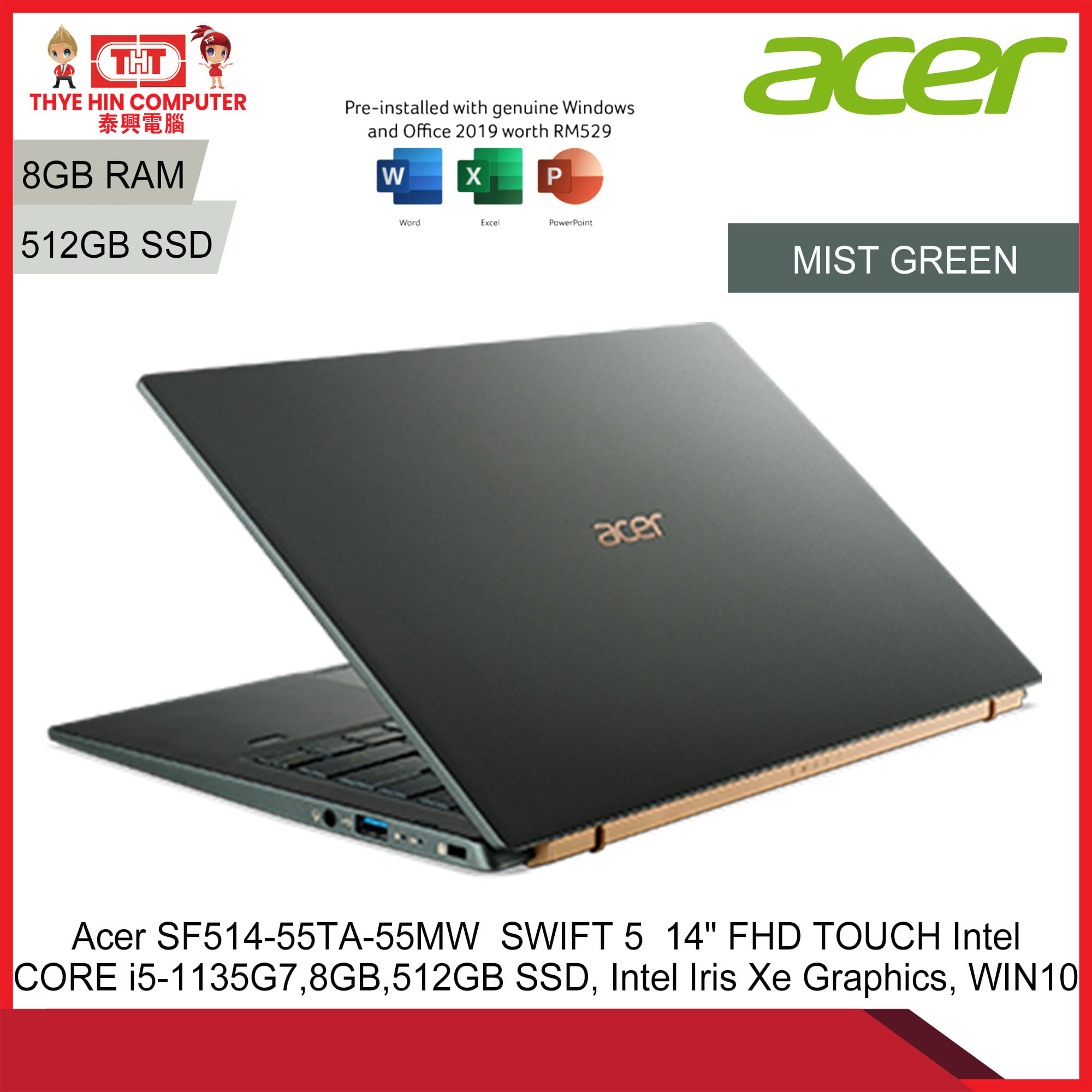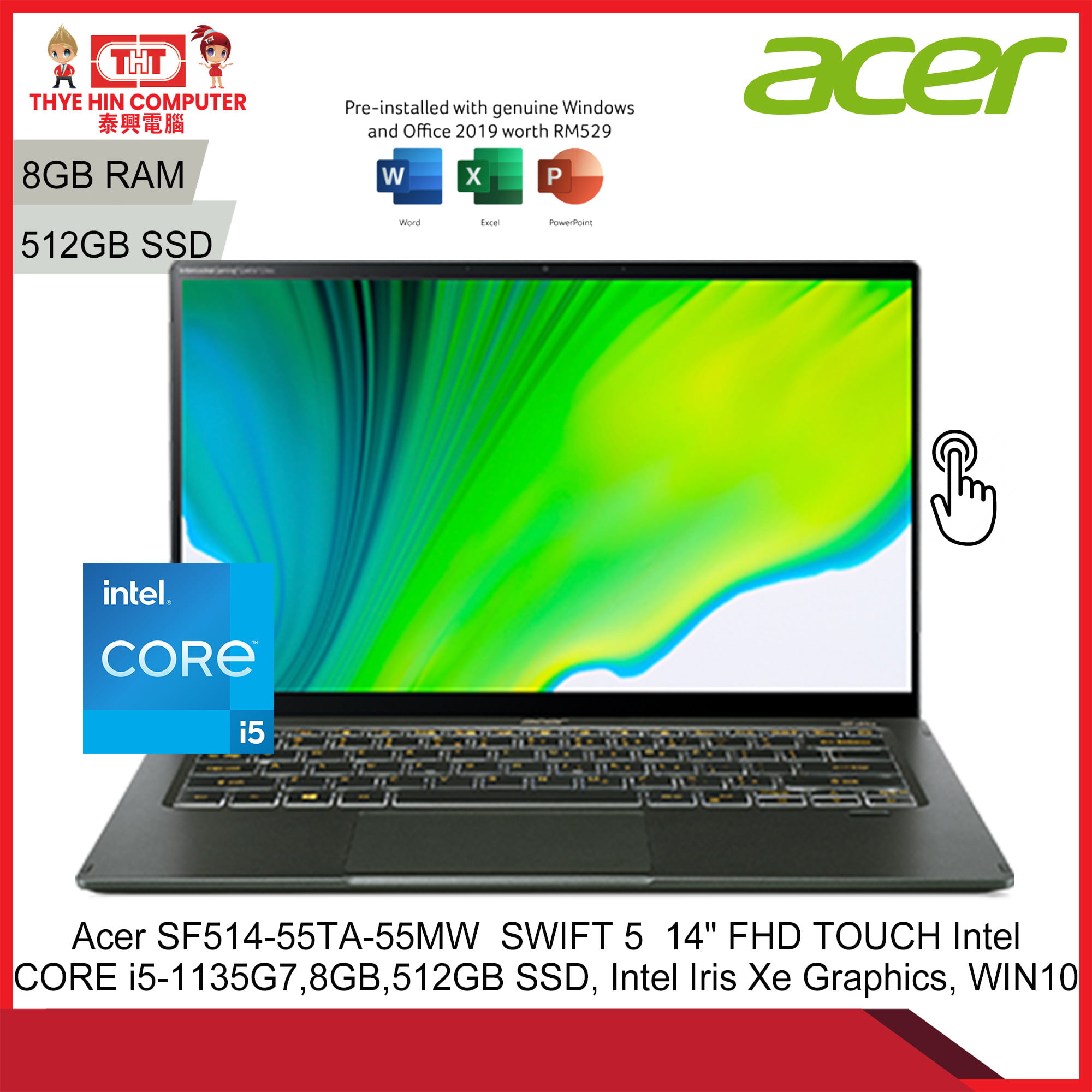 Acer SF514-55TA-55MW SWIFT 5 14″ FHD TOUCH ( Intel CORE i5-1135G7,8GB,512GB SSD, Intel Iris Xe Graphics, WIN 10) [SBN:NO NILAI:NO MELAKA:NO HPS:NO]