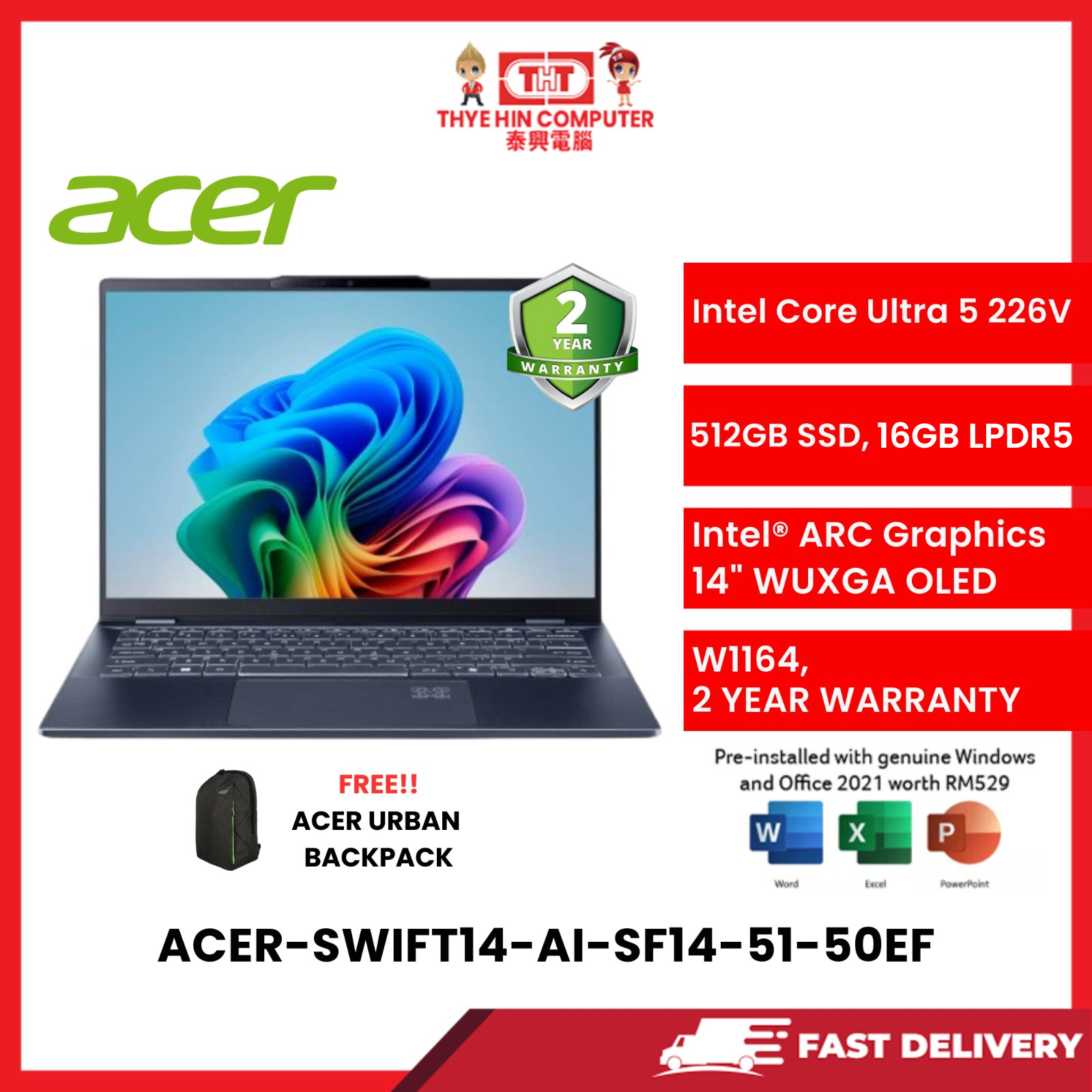 ACER-SWIFT14-AI-SF14-51-50EF-BLUE-INTELCOREU5-226V,16GBR5(OB),512GBSSD,14"WUXGA-OLED,W11H,H&S,2YRS