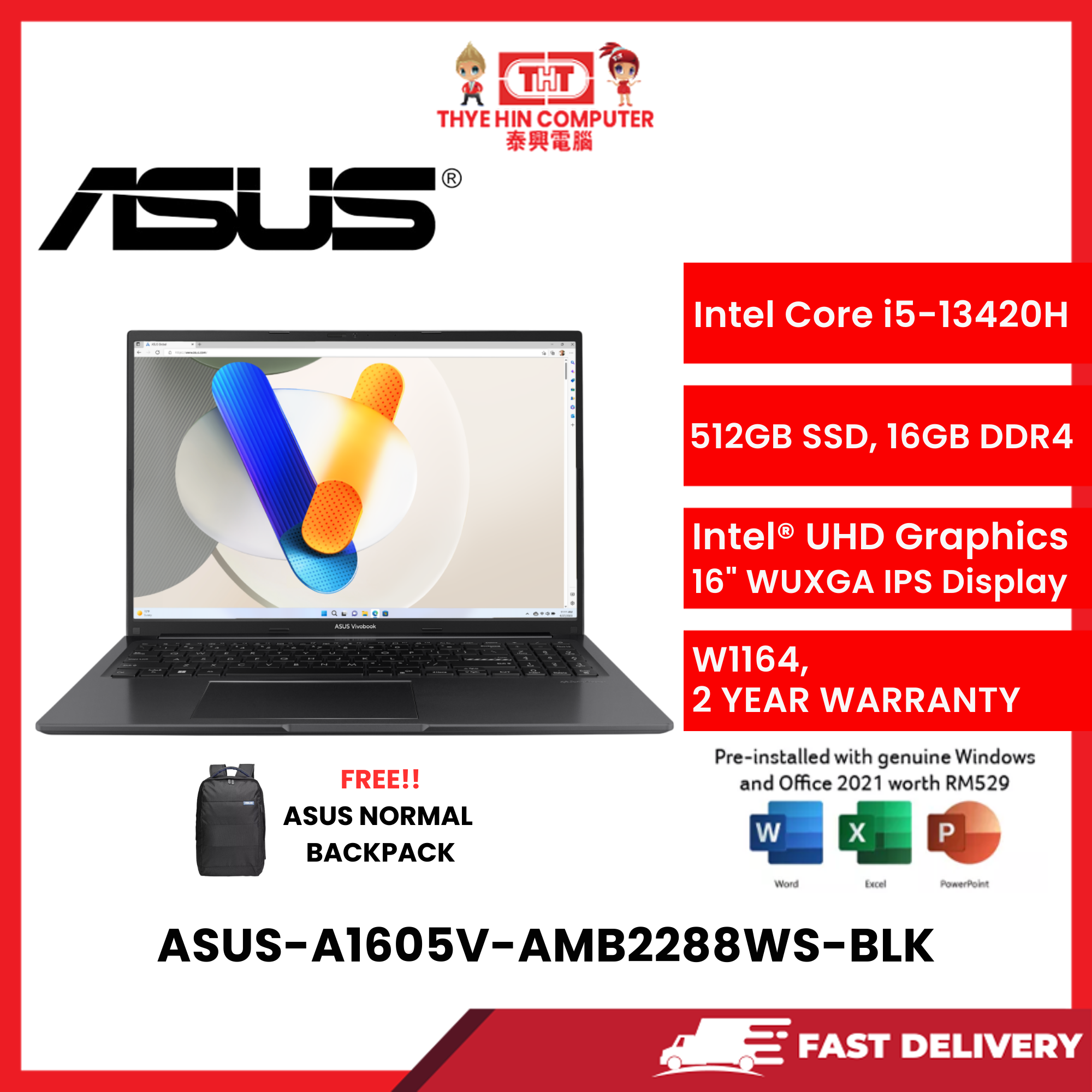 ASUS-A1605V-AMB2288WS-BLK-INTELCOREI5-13420H,16GBR4,512GBSSD,INTELUHD,16"WUXGA,W1164,2YRS,H&S