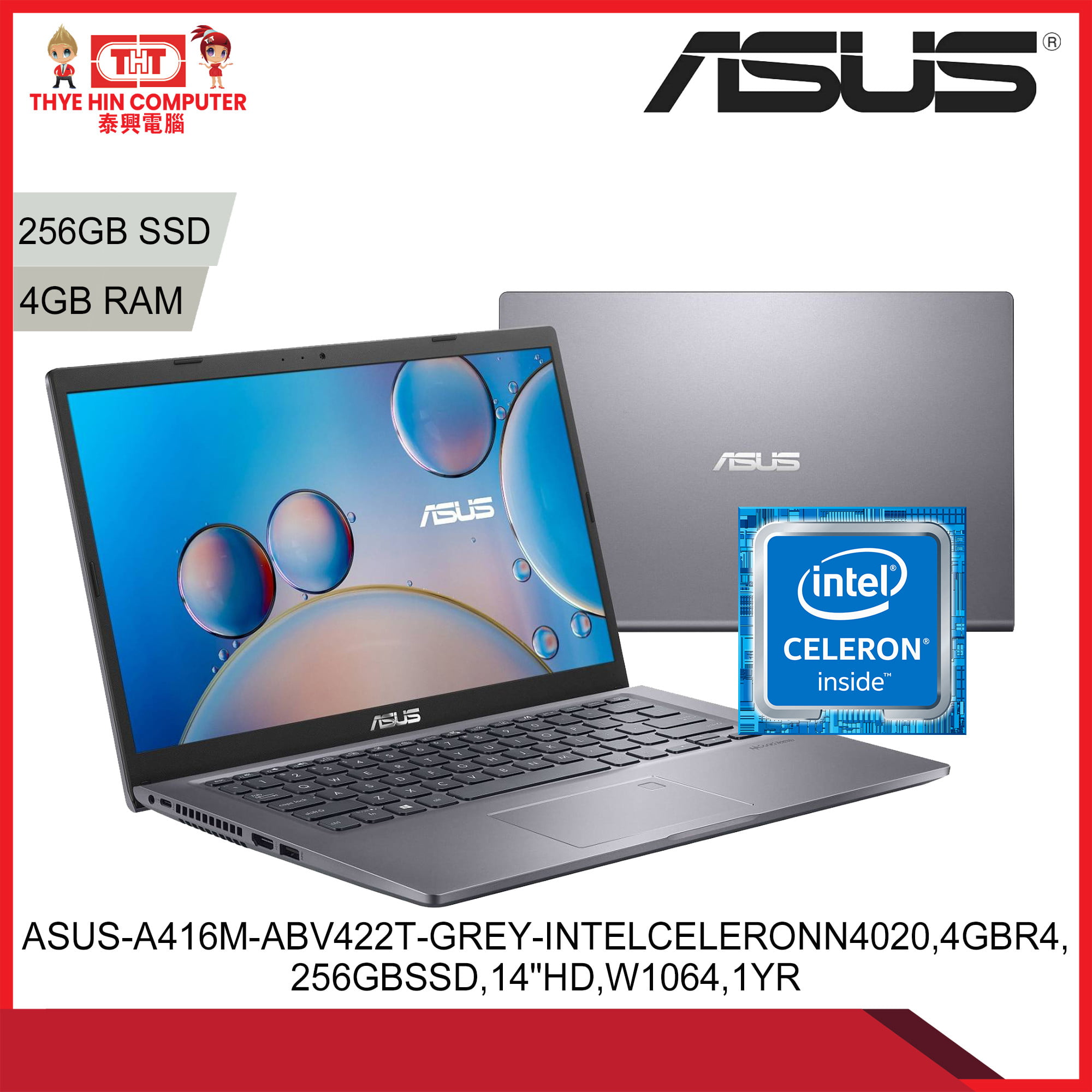 ASUS-A416M-ABV422T-GREY-INTELCELERONN4020,4GBR4,256GBSSD,14″HD,W1064,1YR [SBN:NO NILAI:NO MELAKA:NO HPS:NO]