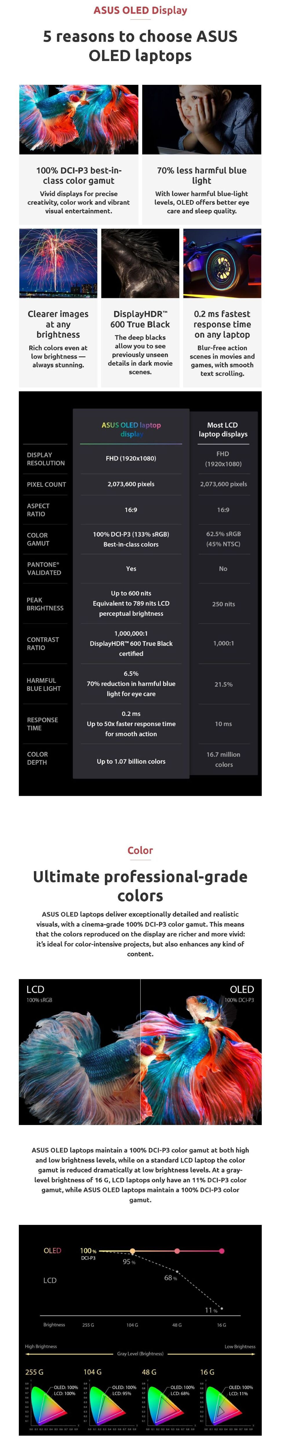 | Display Screen / Design / Resolution | 15.6" OLED FHD (1920 x 1080) 16:9, IPS-level Panel Glossy display, 100% DCI-P3 color gamut, 600nits peak brightness |