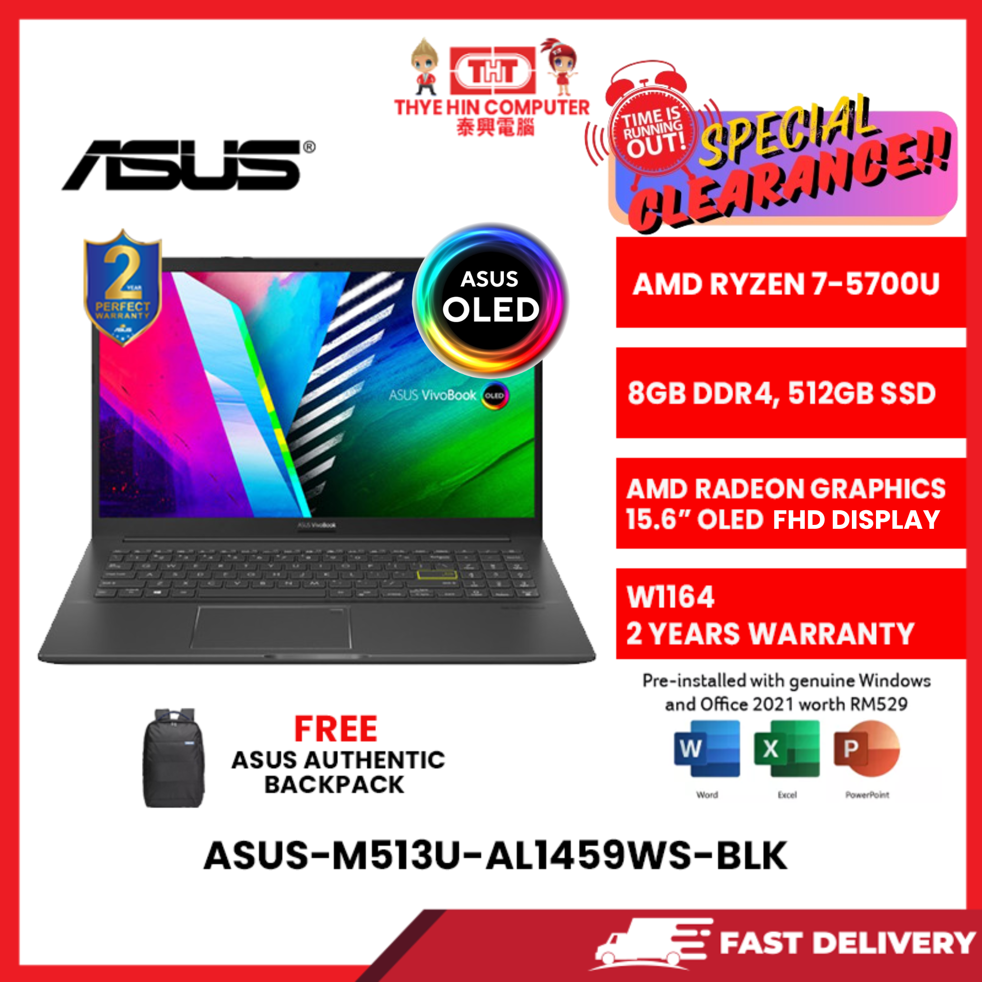 ASUS-M513U-AL1459WS-BLK-AMDRYZEN7-5700U,8GBR4,512GB,AMDRADEON,15.6"OLED,W1164,2YRS,H&S