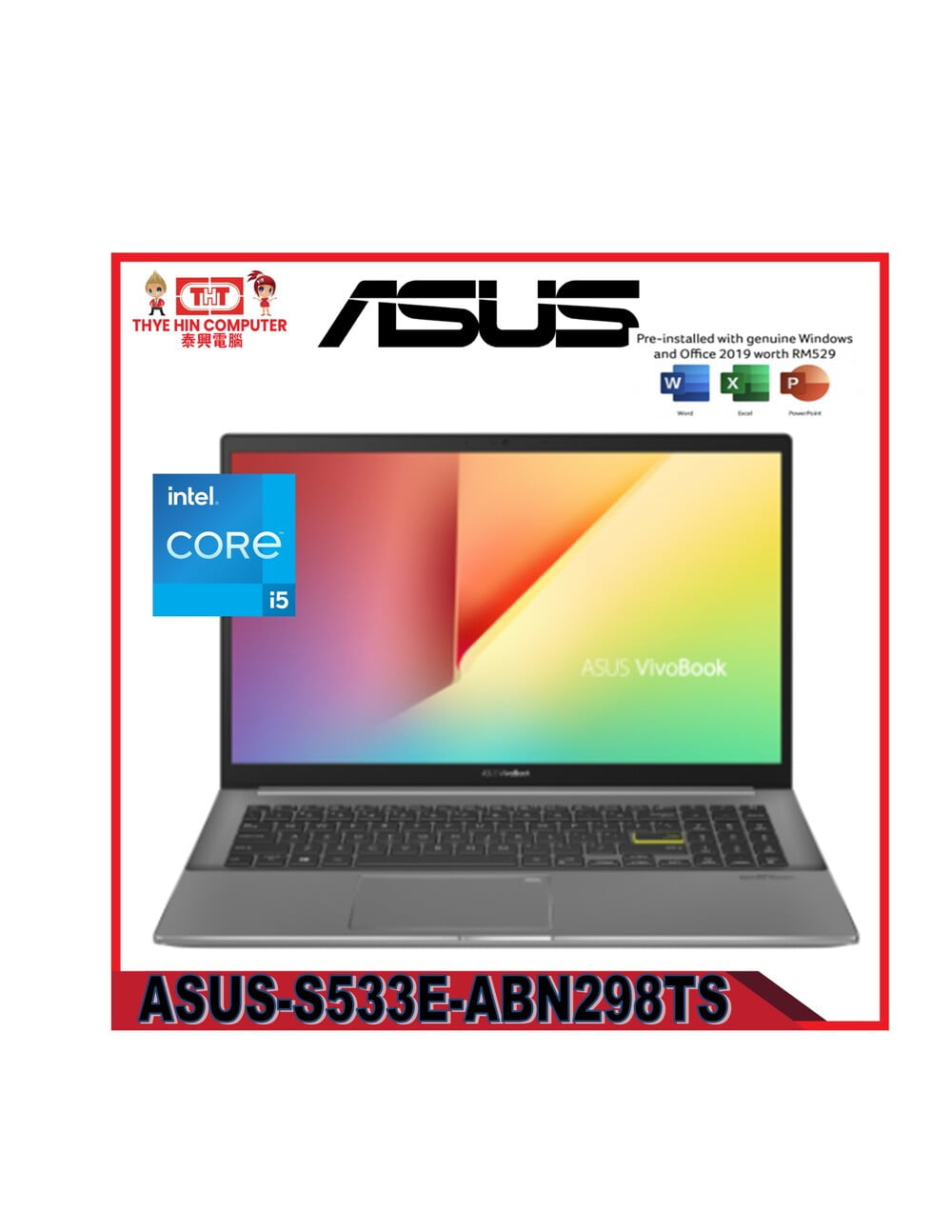 ASUS-S533E-ABN298TS-BLK-INTELCOREI5-1135G7-2.4GHZ,8GBR4,512GBSSD,15.6"FHD,W1064,H&S,2YRS