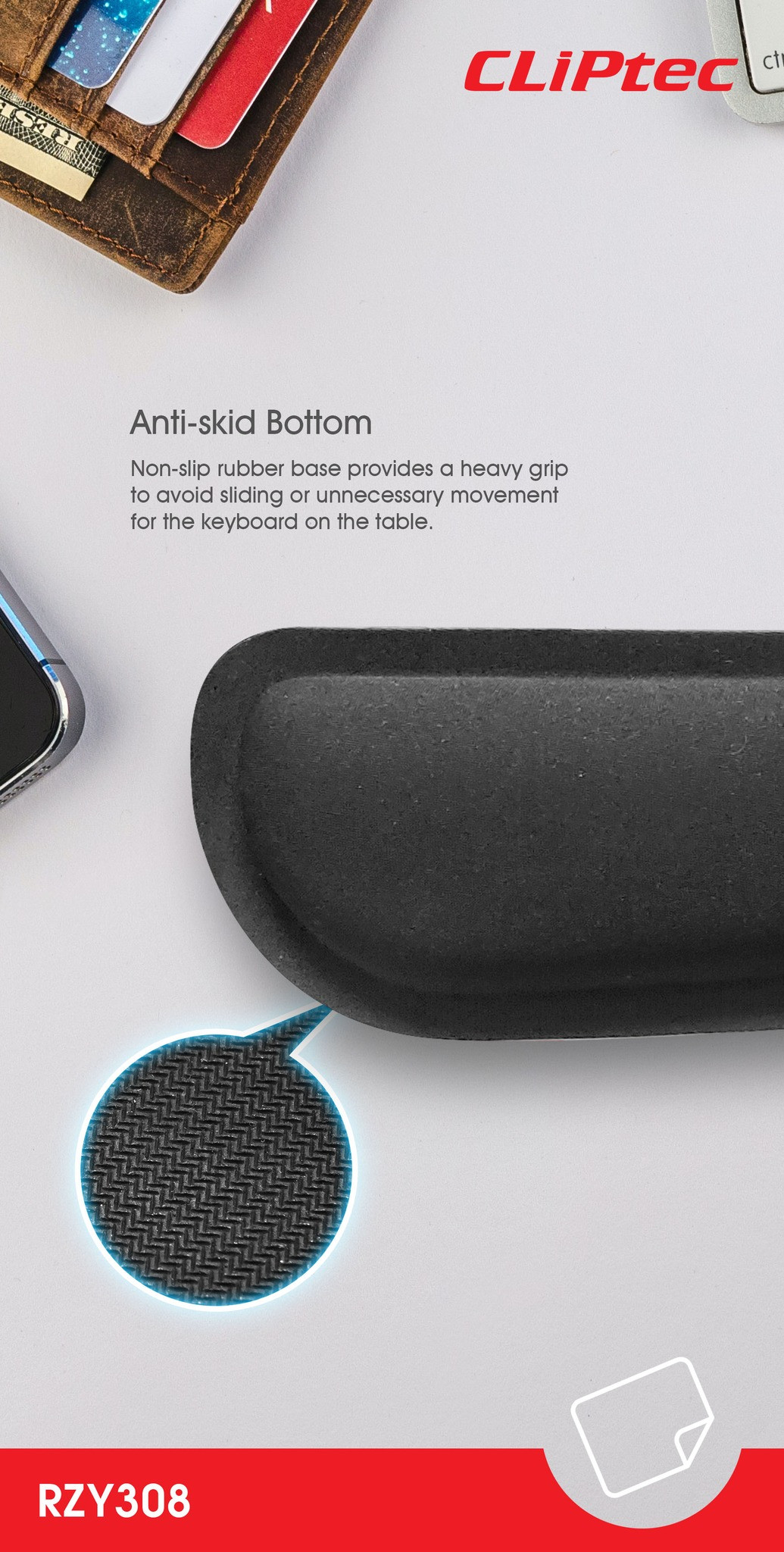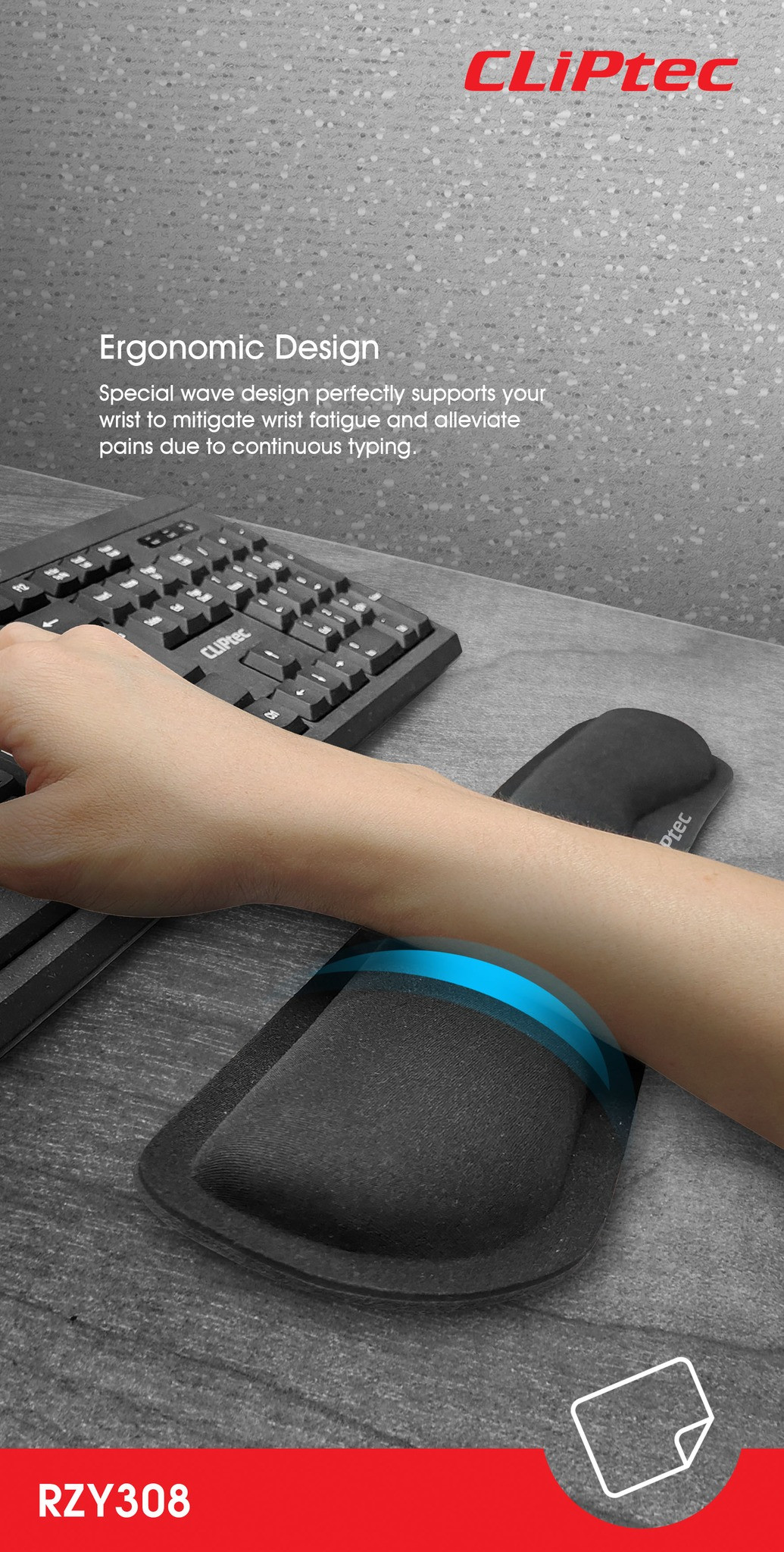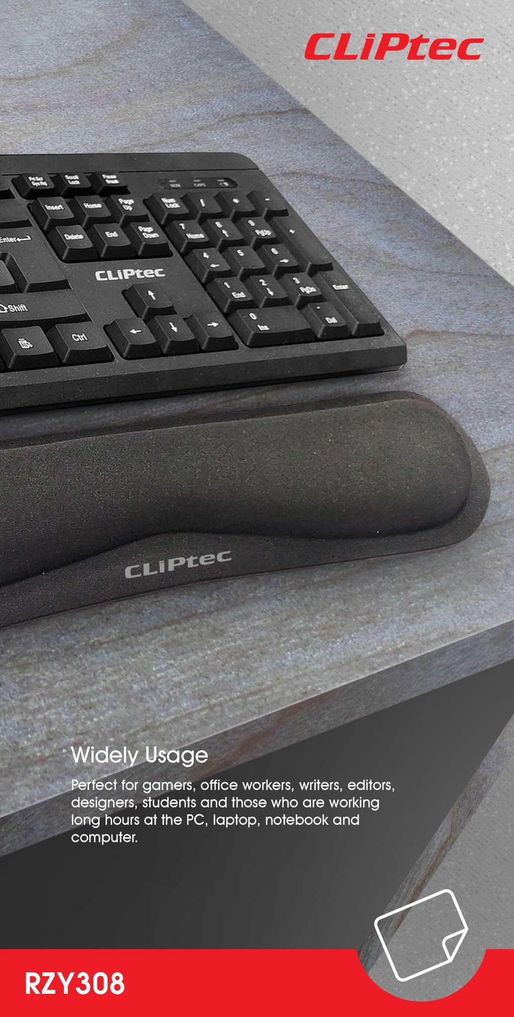 The RZY-308 Cliptec Keyboard Memory Form Wrist Rest Pad you a supports your wrist to mitigate wrist fatigue and alleviate pains due to continuous typing. It is made of Memory foam, slow bounces back, soft texture but not easy to deformation, ideal for longer hours of use to reduces irritations and wrist pain. Non-slip rubber base provides a heavy grip to avoid sliding or unnecessary movement for the keyboard on the table. This wrist pad is prefect for gamers, office workers, writers, editors, designers, students and those who are working long hours at the PC, laptop, notebook and computer.