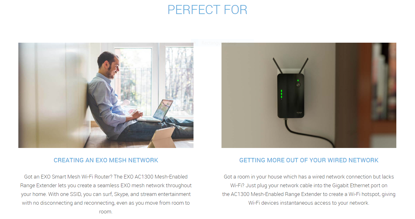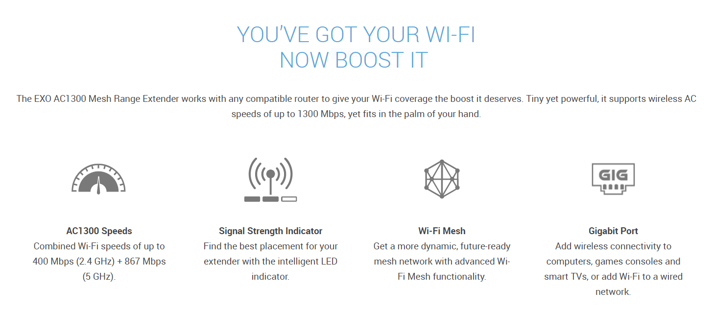 The EXO AC1300 Mesh-Enabled Range Extender combines with any EXO Smart Mesh Wi-Fi Router to bring you Wi-Fi Mesh – our signature mesh that turbocharges your whole home network with a ton of advanced features that add massive functionality to your mesh network. Feel the future of mesh with Wi-Fi Mesh today!