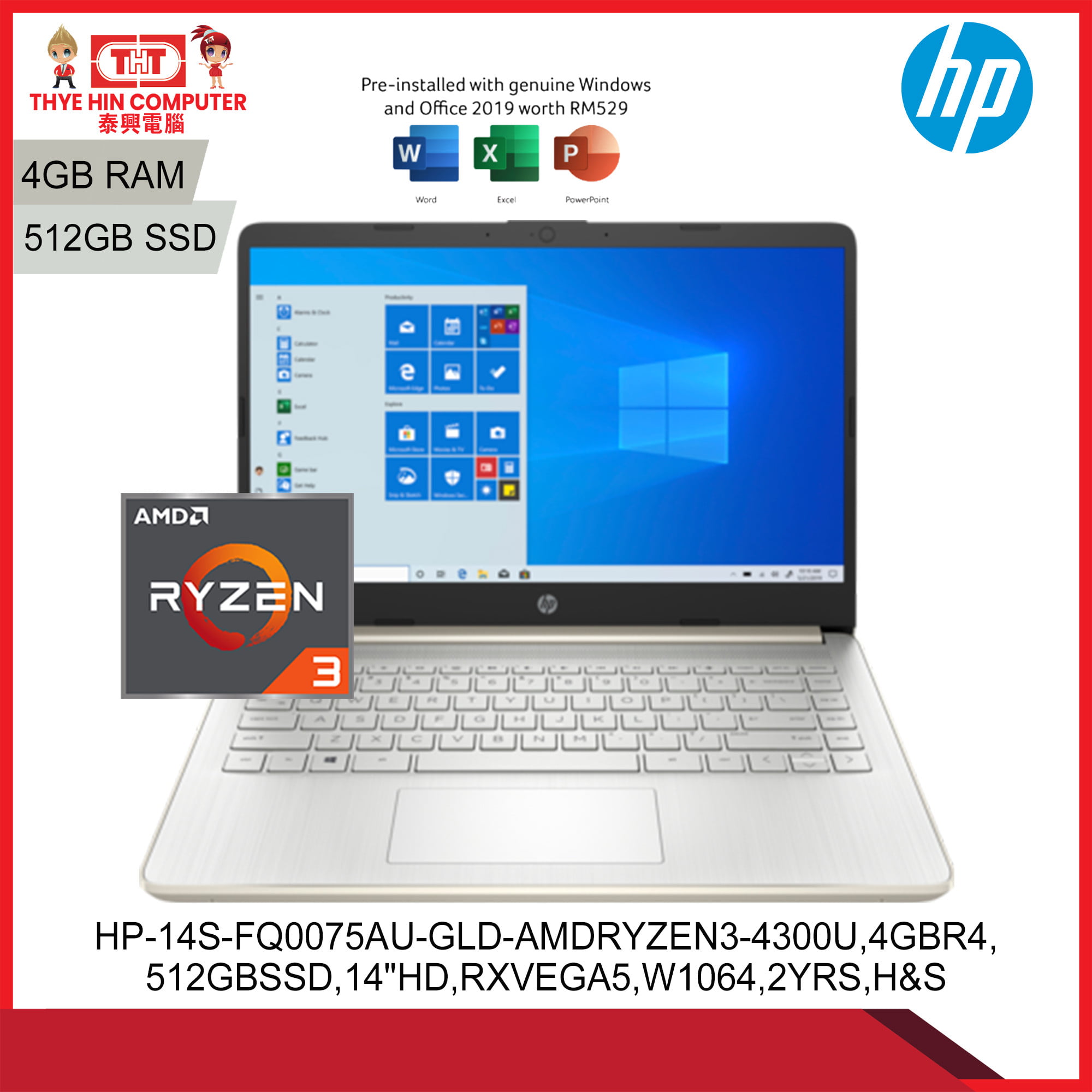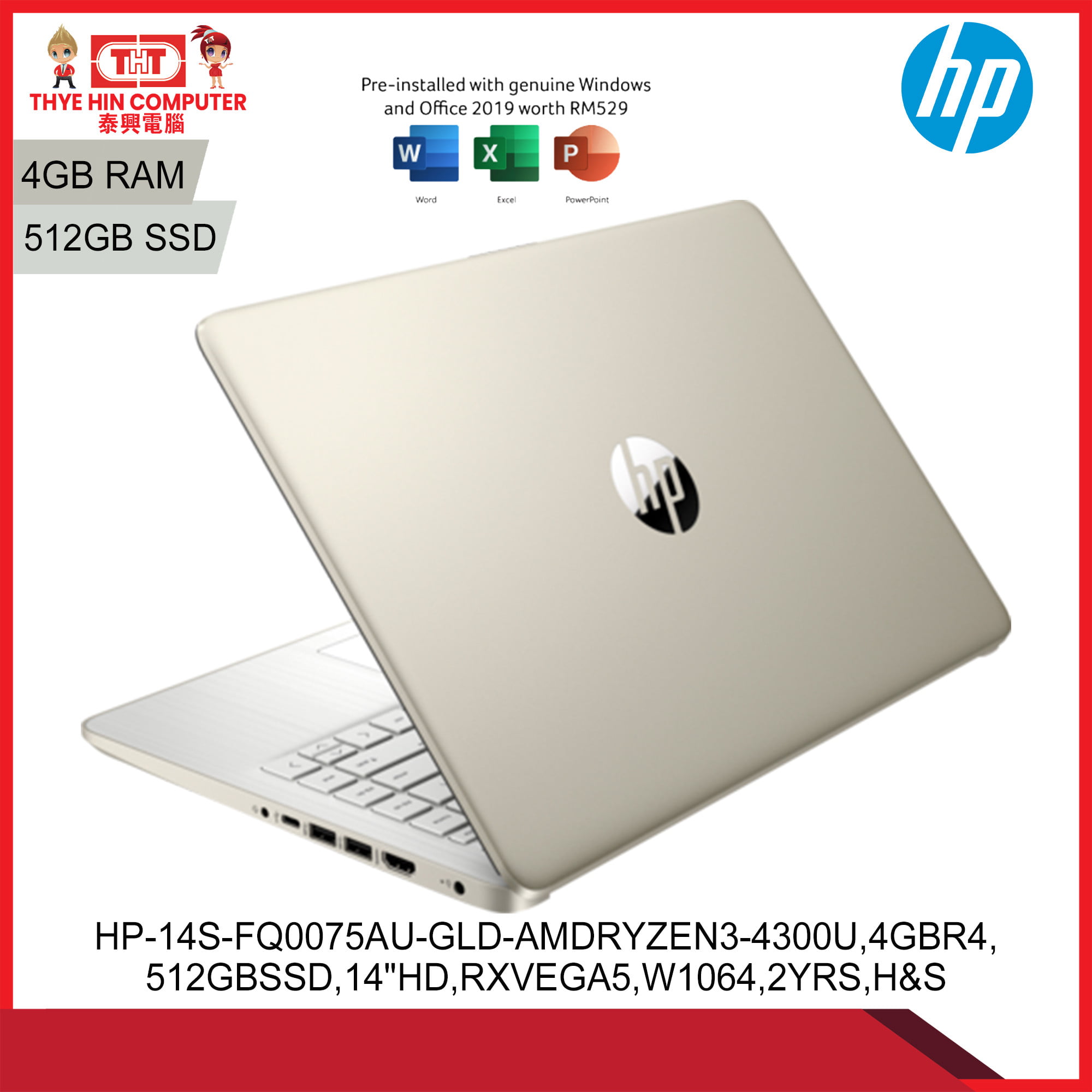HP-14S-FQ0075AU-GLD-AMDRYZEN3-4300U,4GBR4,512GBSSD,14"HD,RXVEGA5,W1064,2YRS,H&S