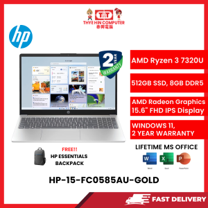 HP-15-FC0585AU-GOLD-AMDRYZEN3-7320U,8GBR5,512GBSSD,AMDRADEON,15.6″FHD,W1164,2YRS,H&S [SBN:YES NILAI:YES MELAKA:YES HPS:NO]