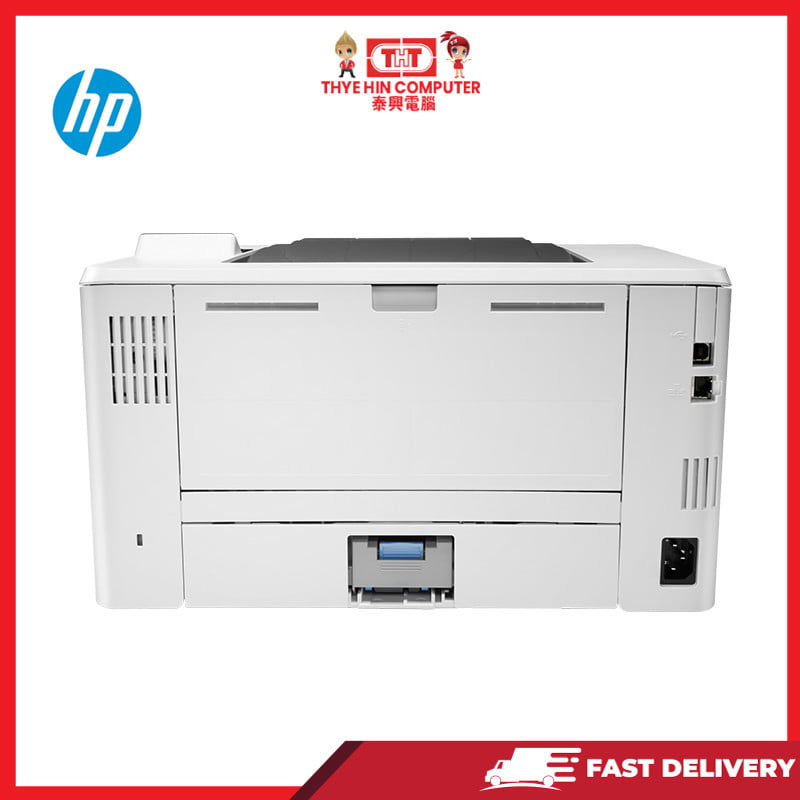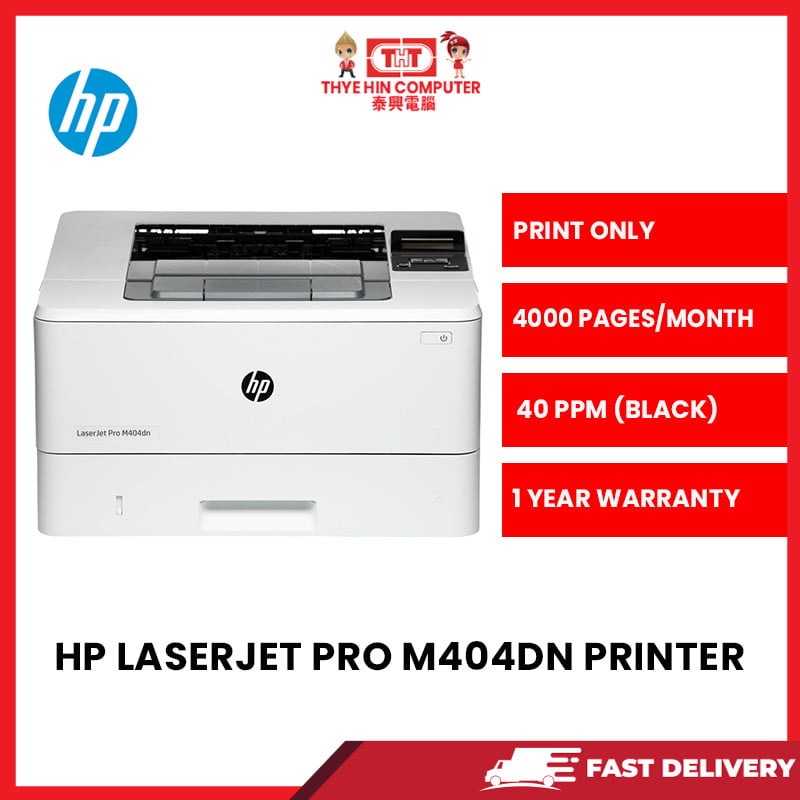 What's in the box: HP LaserJet Pro M404dn; Preinstalled HP Black LaserJet Toner Cartridge (59A for EMEA, 58A for AMS, 76A for AP, yield ~3,000 pages); Getting Started Guide; Support Flyer; Warranty Guide; Regulatory Flyer; Power cord; USB cable (AP Only)