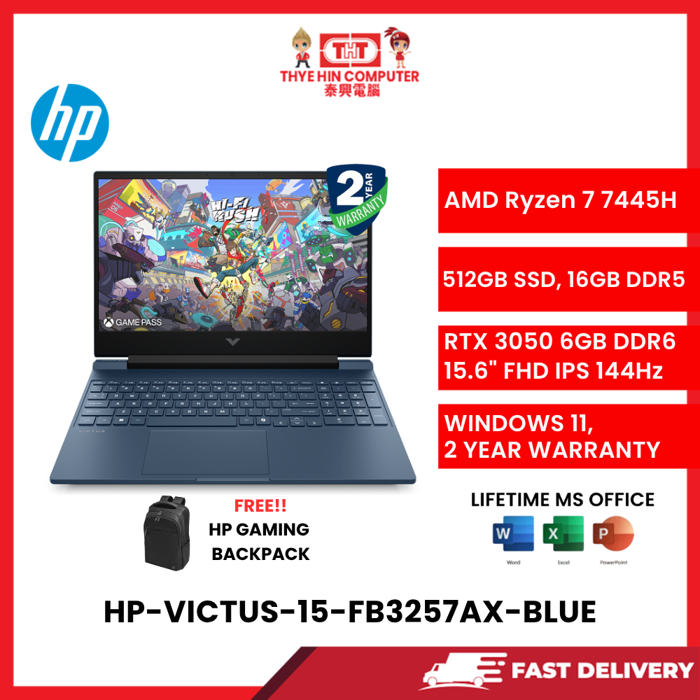 HP-VICTUS-15-FB3257AX-BLUE-AMDRYZEN7-7445H,16GBR5,512GBSSD,RTX30506GVR6,15.6FHD,W1164,2YRS,H&S [SBN:NO NILAI:NO MELAKA:YES HPS:NO]