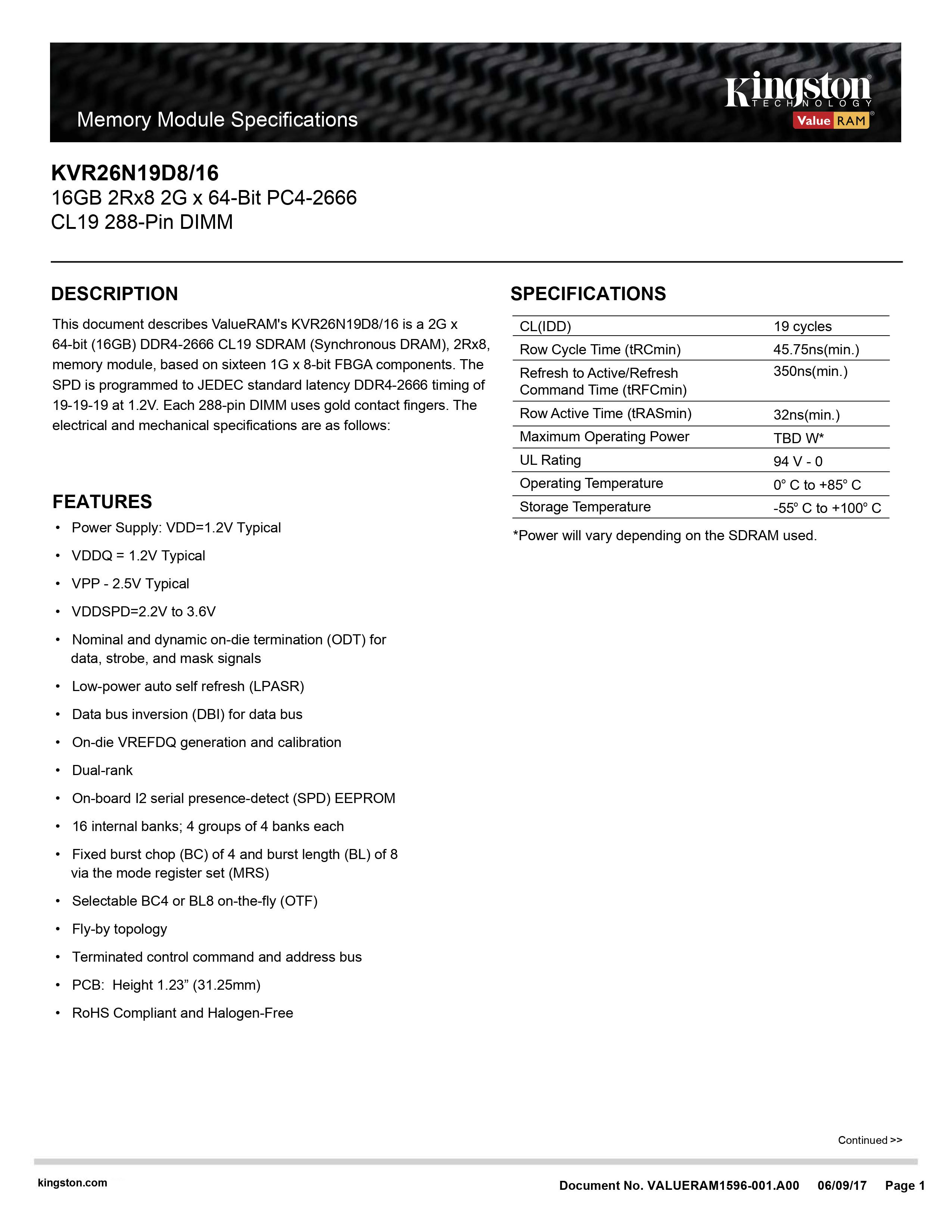 KINGSTON 16GB DDR4 2666MHZ PC RAM KVR26N19D8/16 [SBN:NO NILAI:NO MELAKA:NO HPS:NO]