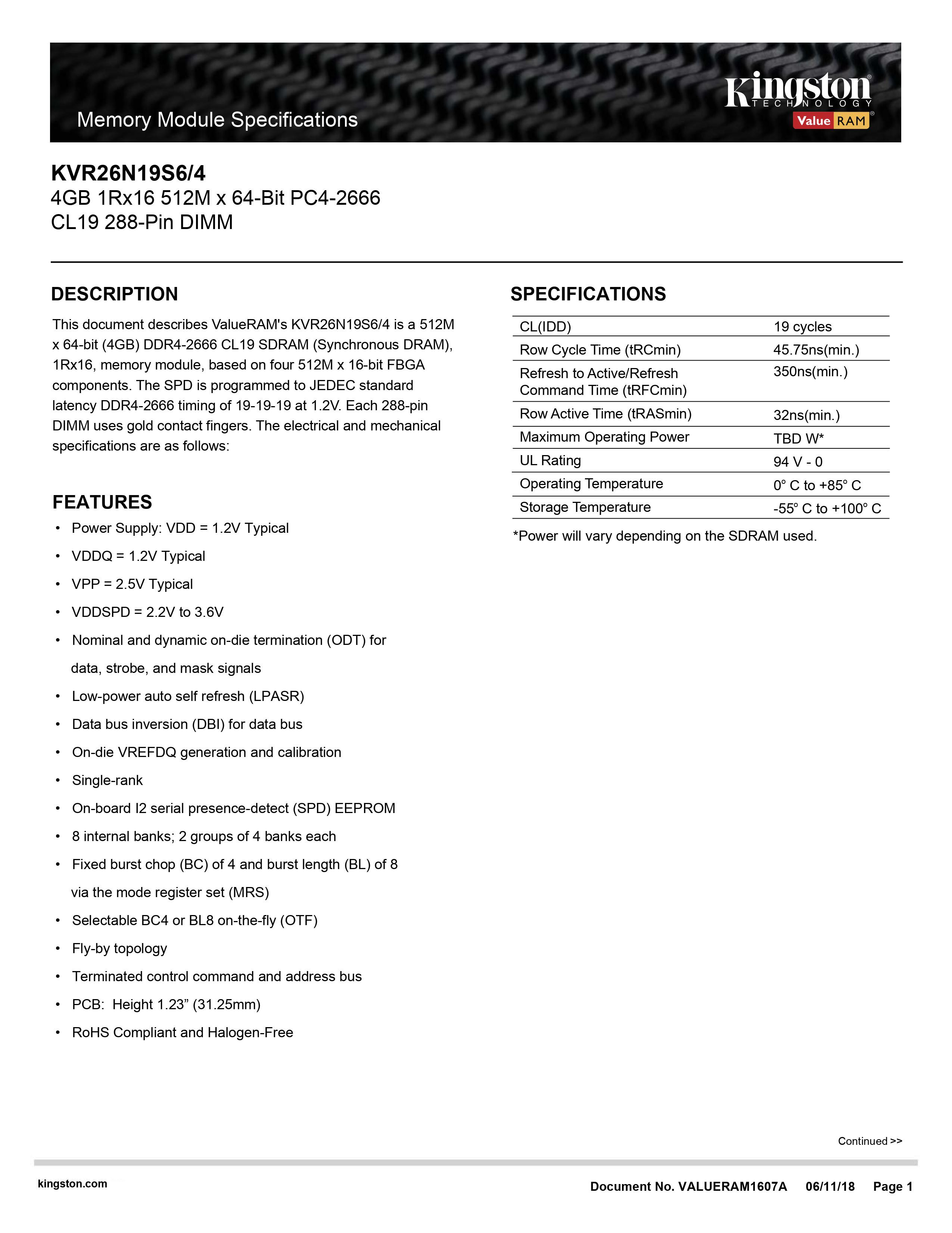 KINGSTON 4GB DDR4 2666MHZ PC RAM KVR26N19S6/4 [SBN:NO NILAI:NO MELAKA:NO HPS:NO]