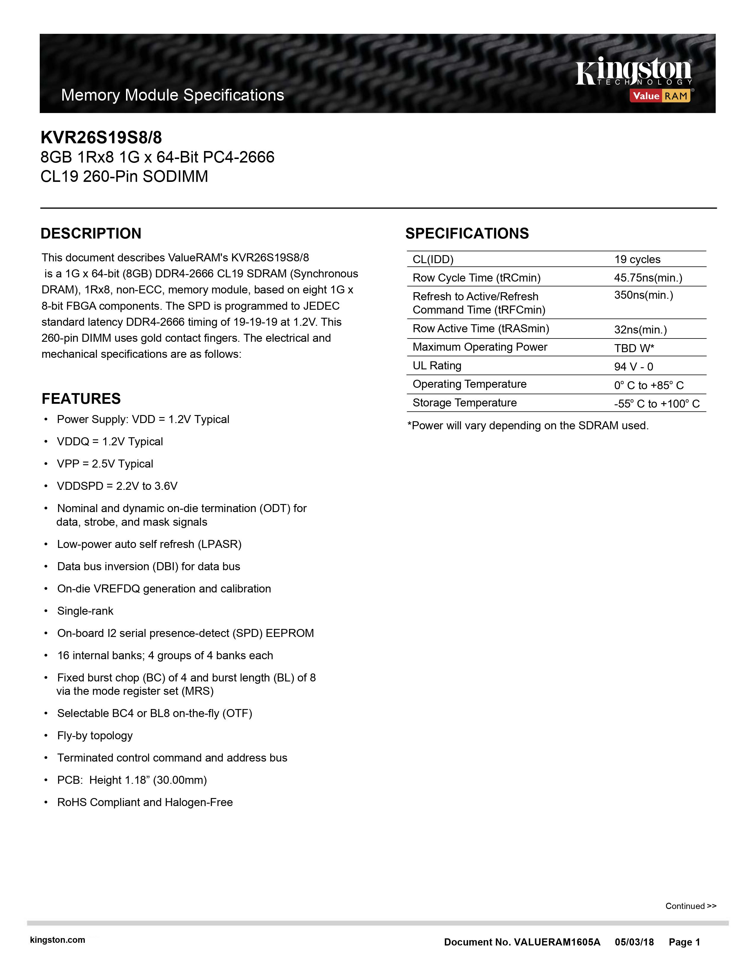 KINGSTON 8GB DDR4 2666MHZ NOTEBOOK RAM KVR26S19S8/8 [SBN:NO NILAI:NO MELAKA:NO HPS:NO]