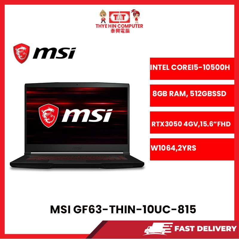 MSI-GF63-THIN-10UC-815-INTELCOREI5-10500H,8GBR4RAM,512GBSSD,RTX30504GVR4,W1064,2YRS [SBN:NO NILAI:NO MELAKA:NO HPS:NO]
